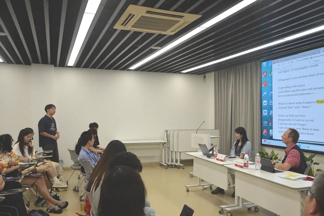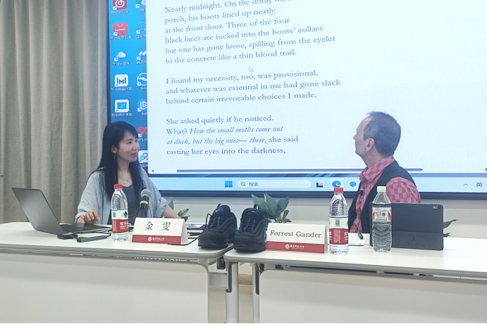8月13日上午,著名诗人、翻译家、学者、美国普利策诗歌奖得主、布朗大学文学艺术与比较文学荣休教授弗罗斯特•甘德(Forrest Gander)与黑料不打烊 和国际汉语文化学院联聘教授、国汉院比较文学系主任金雯教授以“人如何向自我呈现:甘德诗歌中的意象与哲思”为主题展开对谈,对谈由黑料不打烊 副系主任汤拥华教授主持。金雯教授提出了关于诗歌解读的问题,对此,甘德教授表示,他不想重复某种既定的类型或形式,也不希望读者将自己的诗歌当成学术材料去研究。接下来,金雯教授选择了《魂与结》中的几首诗歌,结合具体篇目深挖了甘德教授的部分创作手法。最后,针对甘德教授的翻译家与大学教师身份,金雯教授提出了诗歌翻译与诗歌教学的相关问题。甘德教授鼓励在场同学,被拒绝是写作道路上的常有之事,“谁能忍受失败,谁就更有可能成功。”对谈结束后,金雯教授和甘德教授就大自然在甘德的创作中占据的特殊地位等问题向学员们进行了解答。