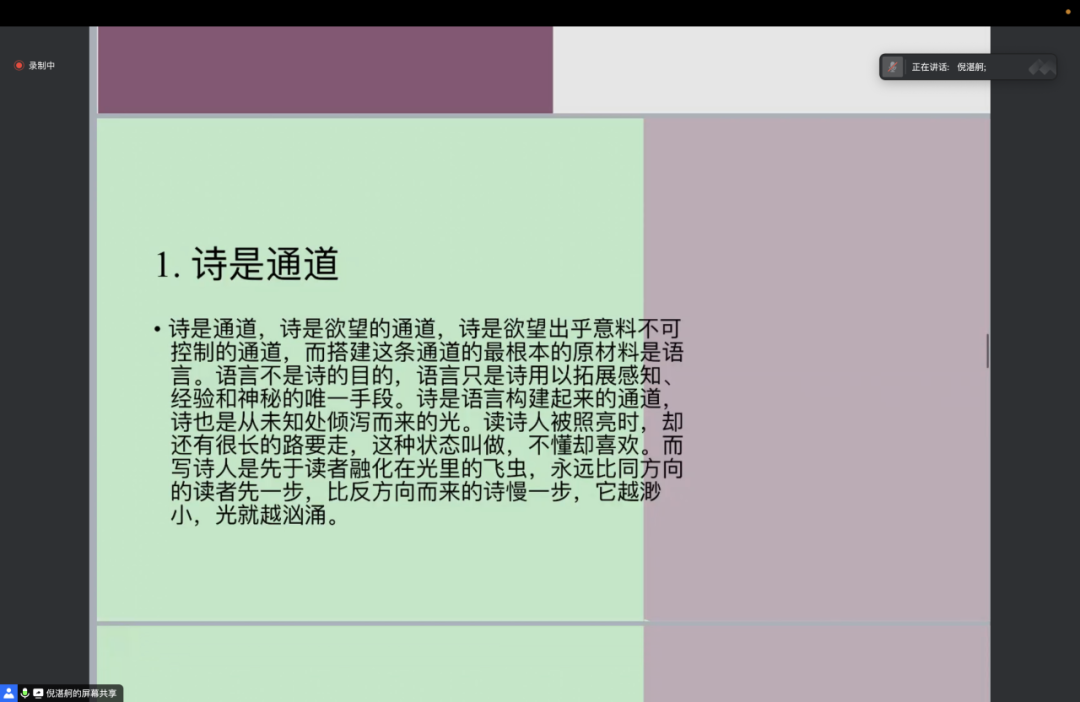 8月15日上午,芝加哥大学神学院宗教与文学博士(2009)、哈佛神学院“宗教中的女性研究”研究员(2010-11)、法国南特高等研究院研究员(2021-22)、著名诗人、作家倪湛舸教授以“诗与克苏鲁”为主题进行专题讲座,讲座由暑期学校班主任叶杨莉老师主持。首先,同样作为诗人的倪湛舸教授从自身经验出发,叙说了自己读诗和写诗的经验。对于诗歌的认知与创作,倪湛舸教授自称为“克系诗人”,认为诗的有趣之处不在于涌现,而在于逃逸。其次,倪湛舸教授讲述了关于理论界的“克苏鲁转向”:人类灭绝说、人类超越说、反人类中心主义说,并且结合了几位学者的克苏鲁讨论,观看其他学者如何解析克苏鲁的意义与反意义。最后,倪湛舸教授就克苏鲁与写作相关问题和同学们进行了交流。