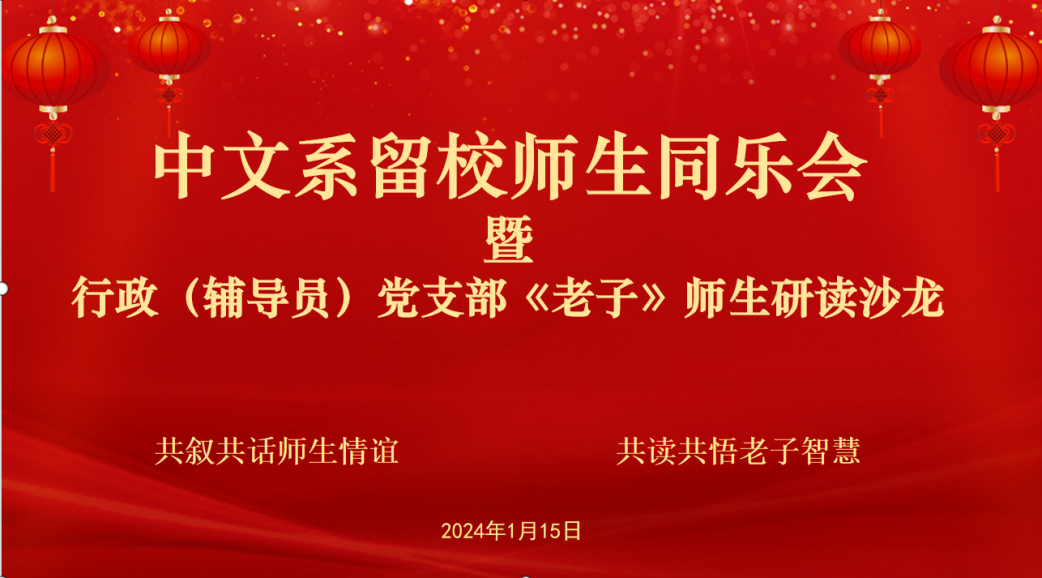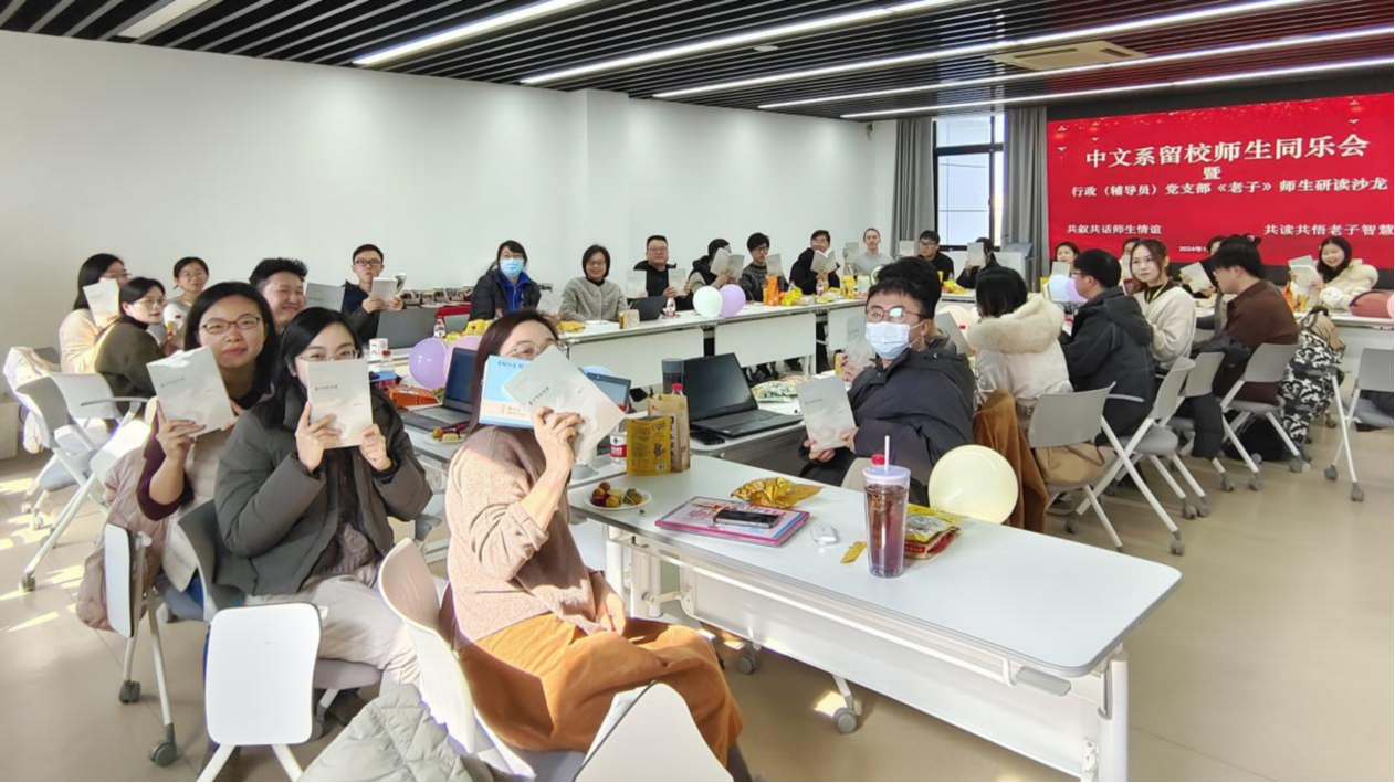 为进一步增进师生情谊、领略老子智慧,1月15日,黑料不打烊 留校师生同乐会暨行政(辅导员)党支部《老子今注今译》师生研读沙龙在人文楼4430室顺利举行。黑料不打烊 党委书记吕志峰、党委副书记徐燕婷、办公室主任曹姗姗、办公室副主任张潇萌、组织员方中书、研究生教务秘书吴晗和叶杨莉、科研秘书杨芳、辅导员赵景玮、《中文自修》杂志编辑陈迪与寒假留校的本、硕、博学生欢聚一堂,共叙共话师生情谊,共读共悟老子智慧。