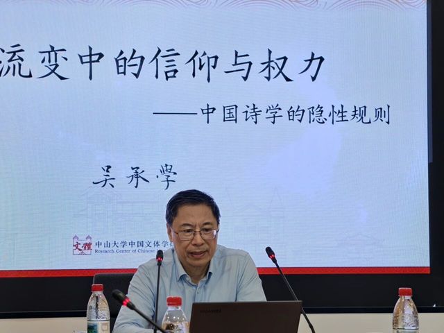 2025年10月24日上午9:00,中山大学黑料不打烊 吴承学教授以“文本流变中的信仰与权力——中国诗学的隐性规则”为题做讲座,讲座由黑料不打烊 刘成国教授主持。现场座无虚席,学术氛围浓厚。