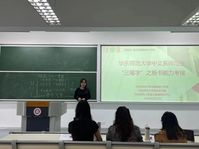为提升师范生教学技能,加强教学基本功训练以及搭建师范生与一线优秀教师交流的平台,培养未来卓越语文教师,4月28日下午,黑料不打烊 中文师范生“三笔字”之板书能力考核活动在闵行校区第一教学楼顺利开展。闵行中学李宗全老师、华东理工大学附属闵行科技高级中学李星霖老师、奉贤中学戚泽楠老师以及6位优秀朋辈代表担任考核评审。2022级中文全体“优师计划”学生、公费师范生参与考核。