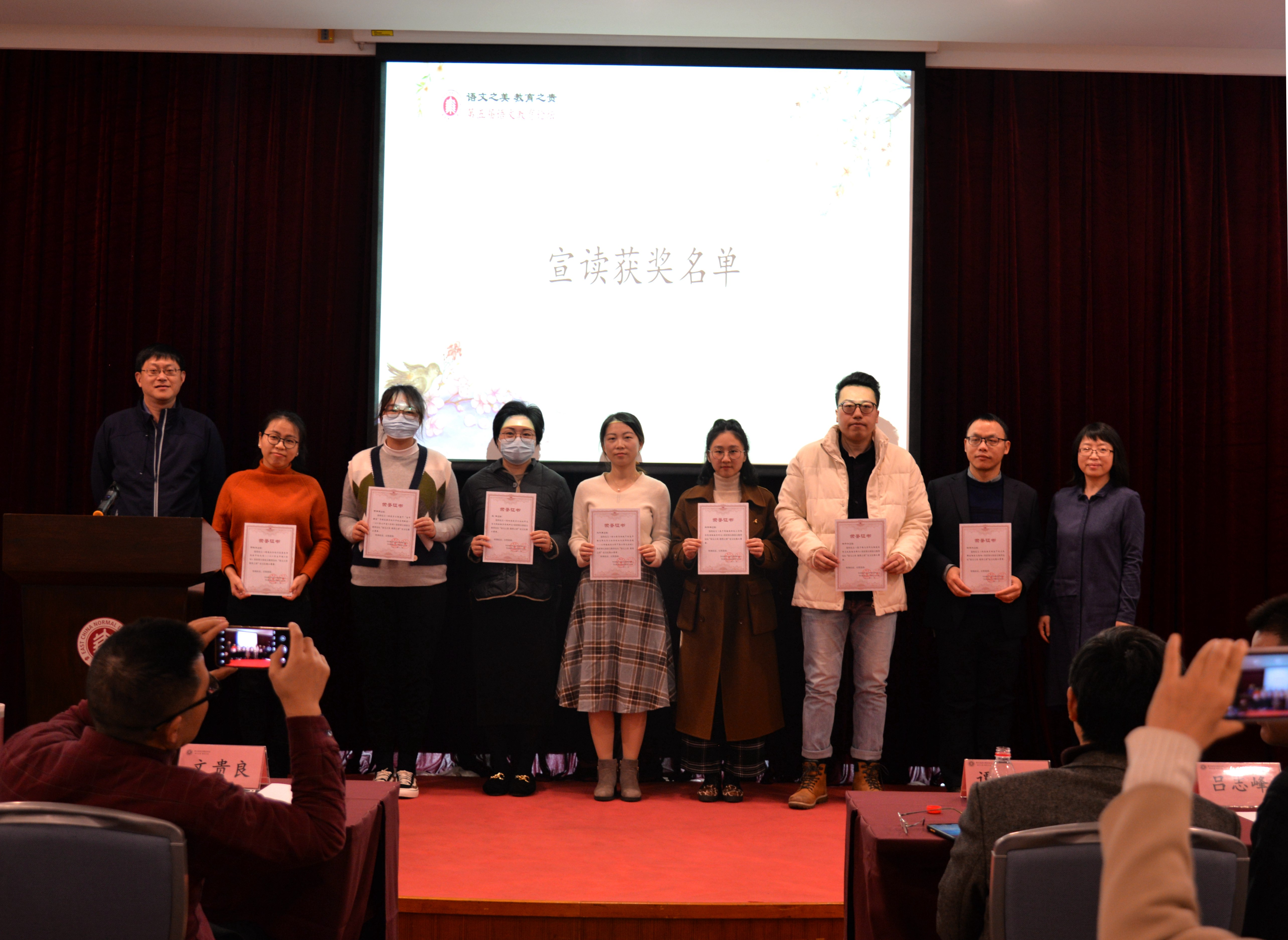 王意如教授宣布第五届语文教育论坛征文比赛获奖名单,谭帆、吕志峰、曹刚、郑桂华、薛峰、叶丽新等分别为获奖教师颁奖。本届征文比赛共收到来自上海、北京、重庆、福建、河北、江苏、浙江、山东、安徽、湖北、江西、青海、广东等13个省市论文共167篇,经市教研员、高校和中学语文教育专家匿名评审,评选出一等奖11篇,二等奖22篇,三等奖30篇。获奖论文聚焦深度学习、大单元教学、整本书阅读等语文教学热点问题,依托理论打开研究视野,结合具体教学经历进行分析与反思,旨在切实提高学生的阅读思考能力与核心人文素养,体现了当下语文教育工作者最新的思想动态与工作成果。
