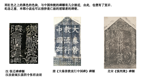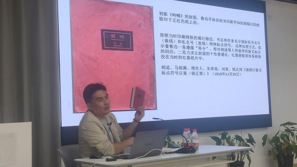 其次,李浩老师正式进入对《呐喊》装帧的分析。李浩老师从《呐喊》成集的疑问出发,强调成集也是一种“寓言”,李浩老师认为《狂人日记》 类似“总章”,小说集以狂人开始,以野蛮结束。《呐喊》作为鲁迅第一部创作小说集,在装帧设计上,鲁迅则先后做过两个版本。初版《呐喊》的封面,是鲁迅手绘仿标宋印刷字体的画稿以阴镀版印于正红色纸上的。同时,李浩老师注意到书名和作者名分别标有书名号(曲线)和私名号(直线)两种标点符号。 这种处理方式,显示着鲁迅一是遵循“将令”,即对胡适等人所倡导的新式标点的回应;二是力求让封面的个性普通化,红黑搭配很容易被淹没在当时的红黑纸片中。李浩老师指出红黑配色是当时中国民间的典型配色,常被用在节庆日,除此之外,也被用在四合院大门的设计中,而黑色的色块也与中国传统的碑额有几分接近,象征着对亡故的前驱者的纪念。因此,李浩老师认为,从红黑配色的封面设计到写“普通人”小说内容等,都是鲁迅“民间性”的表现。