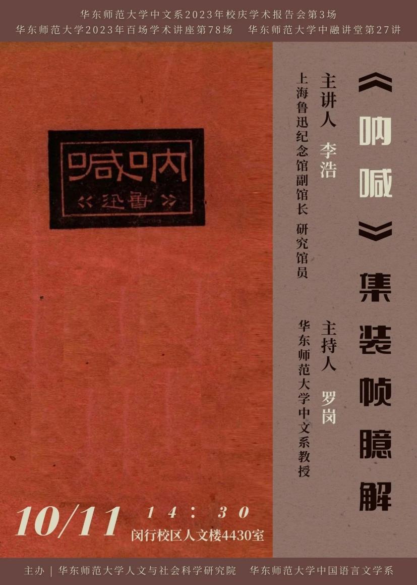 2023年10月11日14:30,上海鲁迅纪念馆副馆长、研究馆员李浩在闵行校区人文楼4430室进行了一场题为“《呐喊》集装帧臆解”的精彩讲座。本次讲座是“黑料不打烊 2023年校庆学术报告会”第3场、“黑料不打烊 2023年百场学术讲座”第78场、“黑料不打烊 中融讲座”第27场,由黑料不打烊 罗岗教授主持,孙晓忠教授等黑料不打烊 诸多师生参与聆听本次讲座。鲁迅不仅是文学家、思想家、革命家,在艺术上也造诣深厚,鲁迅的装帧、篆刻、版画等多种艺术实践和思想也对中国当代美术的发展有着重大的推动作用。李浩老师作为上海鲁迅纪念馆副馆长、研究馆员,在本次讲座中,从自身的工作和研究经验出发,结合丰富的史料探讨鲁迅《呐喊》集的装帧旨趣。