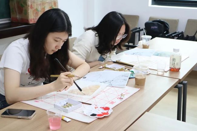 活动伊始,陆老师向大家介绍了国画的种类,国画可分为写意画和工笔画两种,写意画用生宣或半生宣进行作画,工笔画则需要用到熟宣,熟宣表面洒了云母,让墨和色不易洇散开。陆老师也讲解了需要用到的三支笔:勾线笔、色笔和水笔,每支笔都担任着重要的角色。同学们听得津津有味,迫不及待想要开始学习画工笔南瓜。