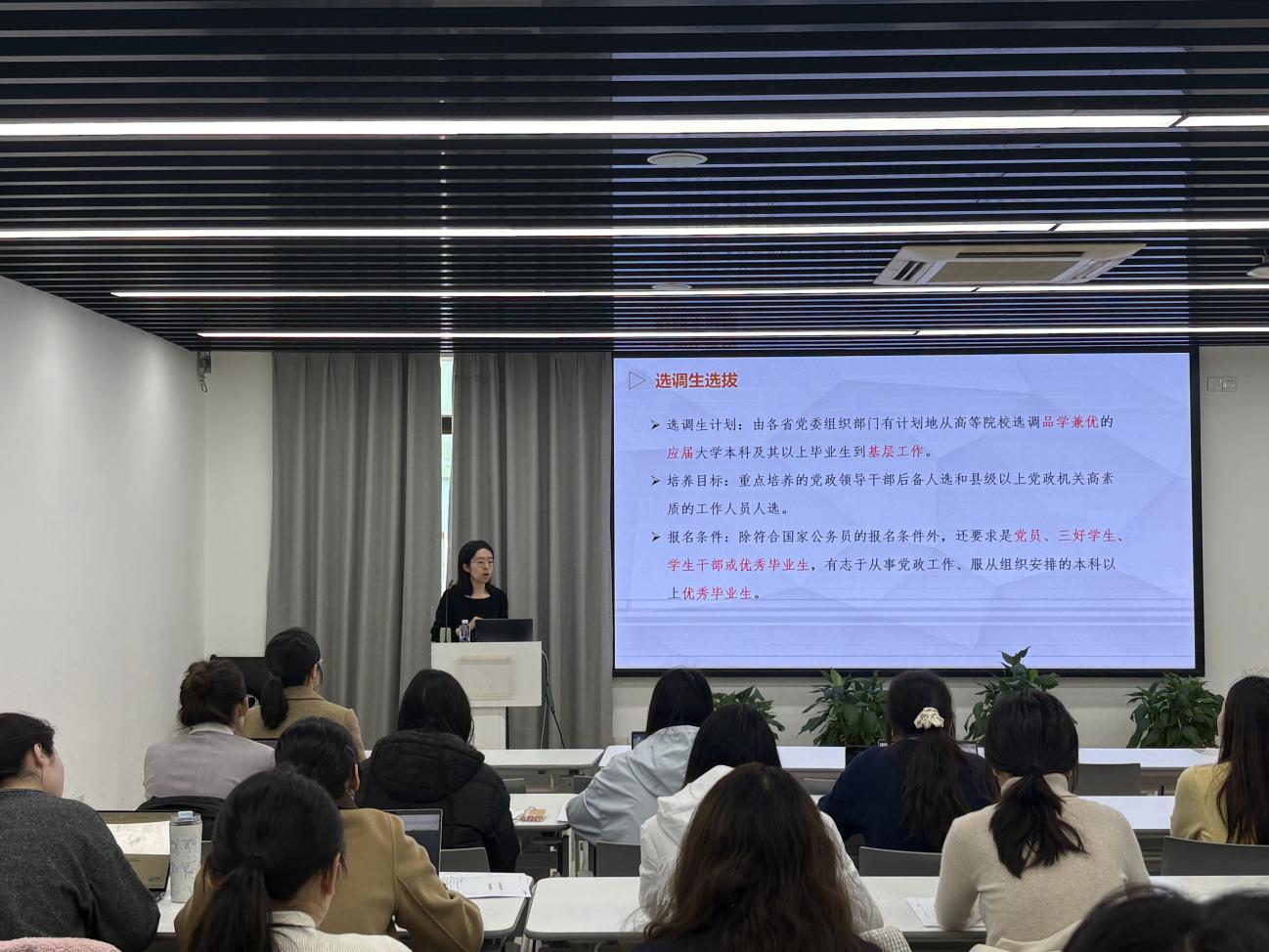 围绕公职类考试的整体框架,孔老师按照“选调生—国考—省考—事业单位”的梯次顺序,详细梳理了各条路径的报考条件、时间节点与备考要点。她强调,选调生作为公务员体系“金字塔”的顶端,面向品学兼优的应届毕业生,虽条件严苛、竞争激烈,但晋升路径清晰、发展空间广阔,是优秀学生的首选方向。国考与省考则构成绝大多数考生的主战场,同样值得关注。而事业单位考试难度相对较低,可作为保底选择,但不应作为唯一目标。孔老师特别提醒,近年来公考竞争日益激烈,笔试分数水涨船高,考生需提前8至10个月系统备考,扎实打好行测与申论基础。