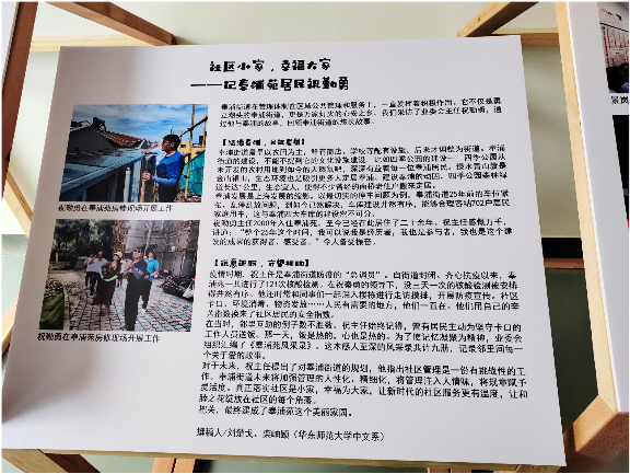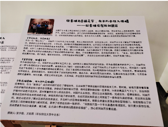 “我们的同学以“家”为主题,选择了对朱德龙、祝勤勇、景岚、张亚菲、刘丽芹五位居民进行采访,渴望了解不同职业的居民眼中不同的奉浦苑,从更个体,更真实的角度去诠释奉浦苑家的故事。”