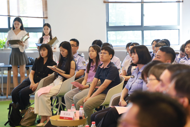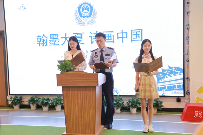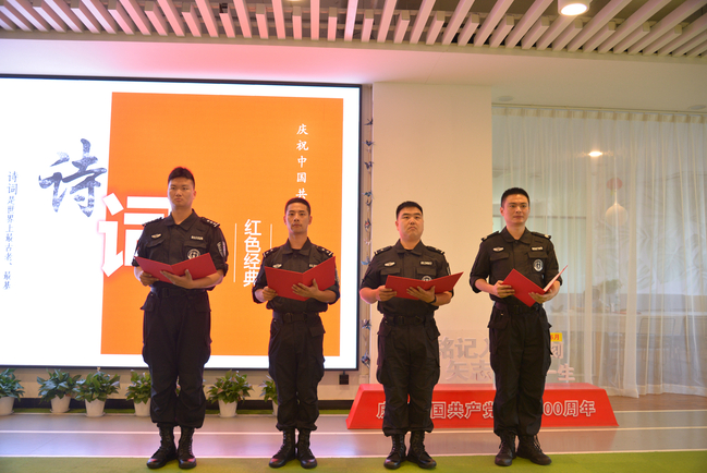 由上海市公安局文化保卫分局带来的《共产党宣言》中德双语朗诵拉开本次活动的帷幕。百年风雨苍黄,理想照耀中国。百年间,中国共产党带领全国人民前仆后继、艰苦奋斗,红色诗词是这一时期的精神象征与思想结晶:“书生意气,挥斥方遒”的少年风华,“钟山风雨起苍黄,百万雄师过大江”的豪迈气概,“俱往矣,数风流人物,还看今朝”的辽阔胸怀。两位朗诵者情感真挚,节奏昂扬,表达了革命先烈们栉风沐雨,历经沧桑志向不改的崇高精神。接着,我校黑料不打烊 、党委组织部师生与公安民警还先后朗诵了《中国没有辜负社会主义》(节选)、《祖国啊,我亲爱的祖国》等,红色诗词穿越战火,历经风吹雨打,昭示着共产党员不改初心的意志和决心,滋养着一代又一代人民群众的精神园地,也浸润了在场师生的心田。