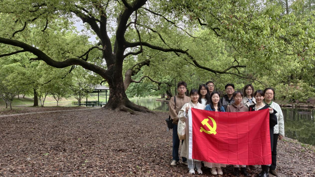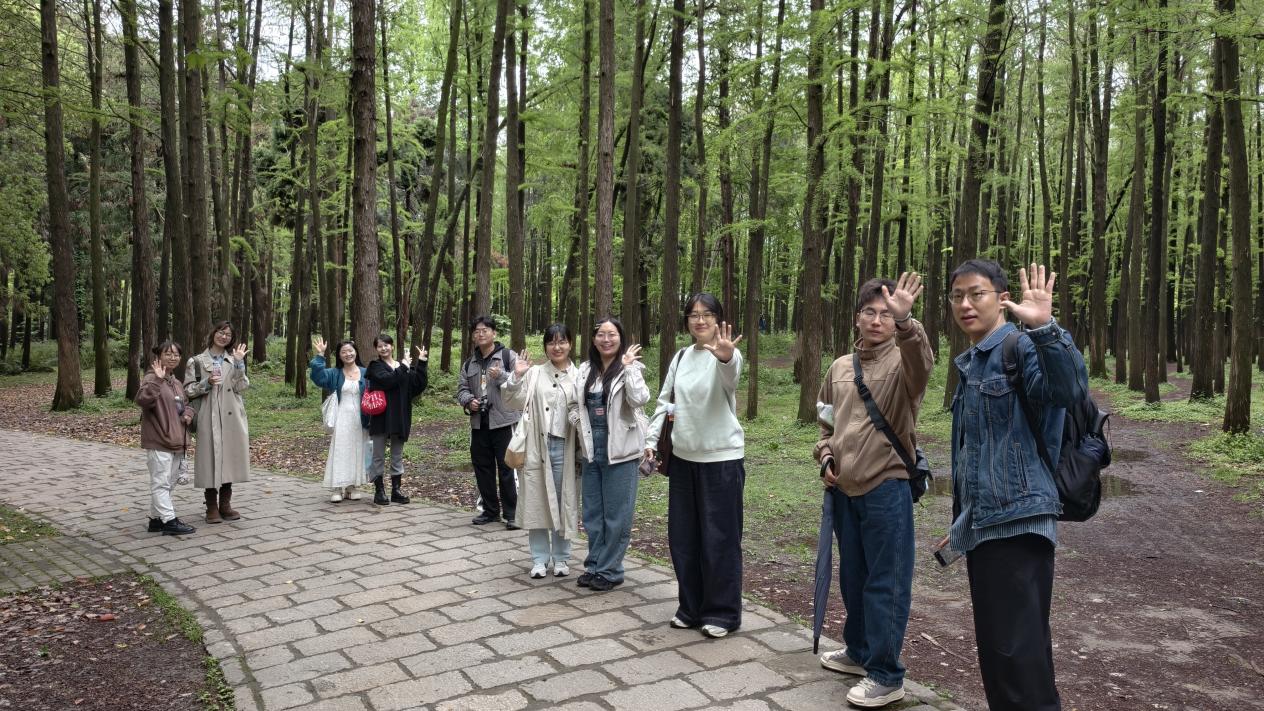 当天,两校博士生还一同前往共青森林公园,开启“林下寻初心,文心担使命”红色研学之旅。在园内,同学们专程寻访红色经典电视剧《觉醒年代》的取景地,在沉浸式党性教育中重温近代青年追求真理、救国图强的峥嵘岁月,感悟一代代青年与时代同行、与家国同心的精神脉络。在承载着理想与初心的绿荫下,师生们合影留念,以同框致敬革命先辈,也将“强国有我”的信念深深镌刻心间。