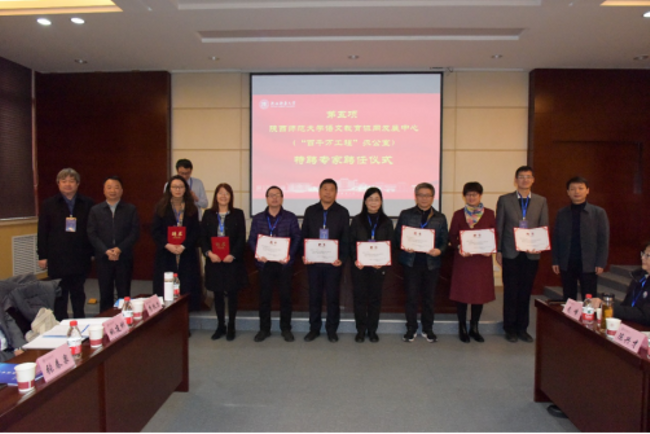 汤拥华教授(右四)在陕西师范大学语文教育协同发展中心特聘专家聘任仪式上被授予聘书