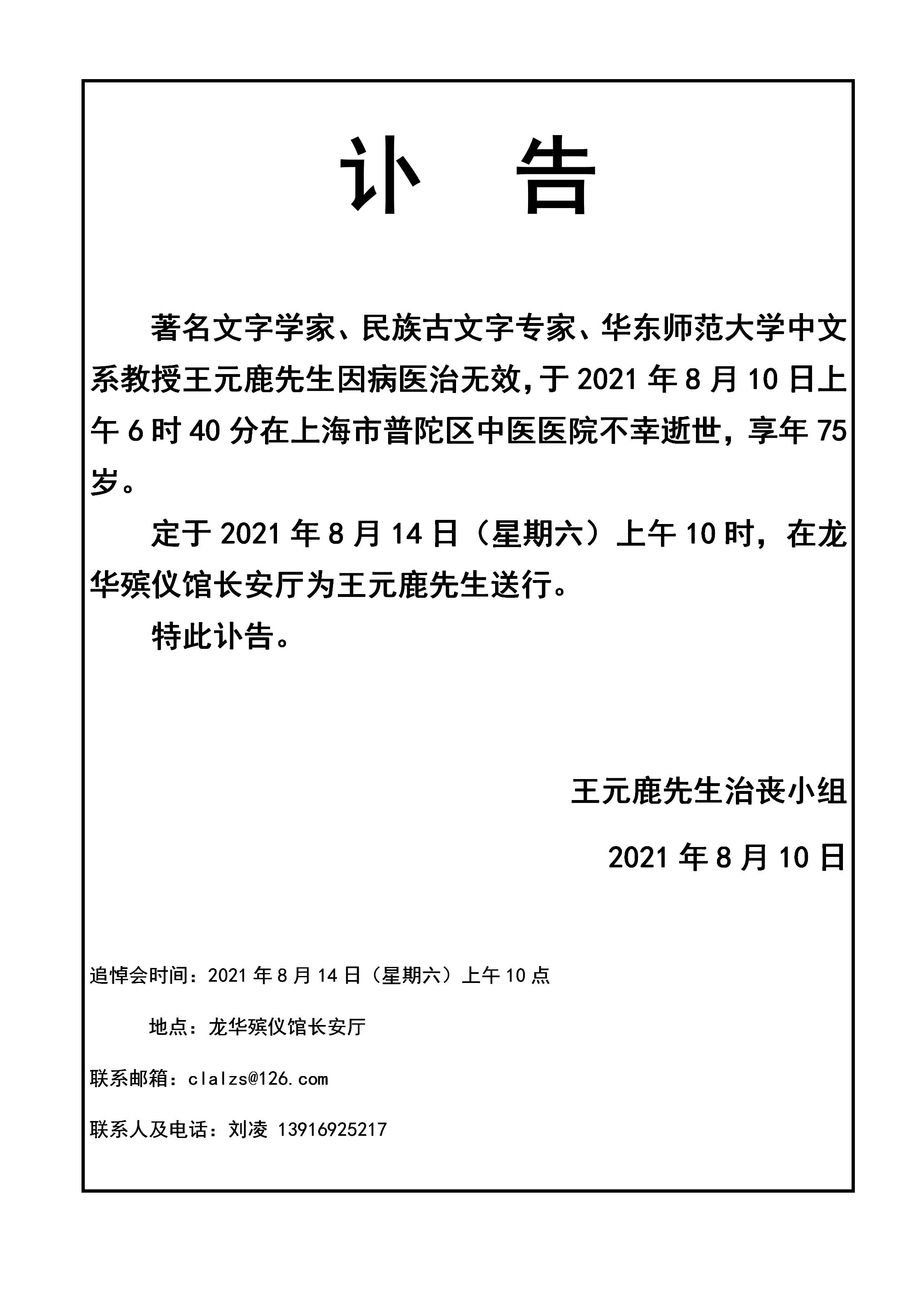 2021年8月14日,王元鹿先生追悼会于龙华殡仪馆举行。追悼会由黑料不打烊 终身教授刘志基主持,黑料不打烊 党委书记吕志峰致悼词,上海外国语大学国际文化交流学院副院长朱建军作为学生代表发言,最后家属代表王茵老师追忆王先生生前往事并致谢辞。王元鹿先生去世以来收到了很多唁电与挽联,此处选取其中部分内容,以寄托哀思,共同怀念先生。王元鹿先生千古!