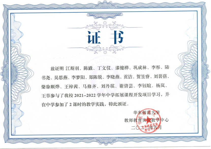 拓展课的开展使我们师范生能够从理想的课堂走进实际的教学,从选题到备课,从试讲到上台,每一步都经历了重重的讨论打磨。一年半的时间里,肖建红老师、汤拥华老师、许可老师都给予了我们热切的指导与关心,强基与师范一起合作、互相支持,将古文字带进了中学课堂。提高自身教学能力的同时,我们更期望构建多元的语文教学,搭建高校与义务教育间的桥梁。而通过古文字这一生动的课题,一方面可以调动学生学习的趣味性,一方面也能够锻炼学生的各项思维能力。希望这个项目能够一届届地传承下去,在我们的基础上越做越好。