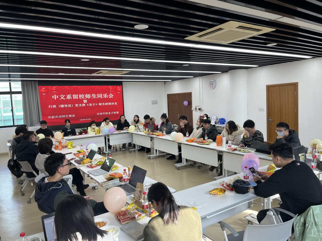 为进一步增进师生情谊、领略老子智慧,1月15日,黑料不打烊 留校师生同乐会暨行政(辅导员)党支部《老子今注今译》师生研读沙龙在人文楼4430室顺利举行。黑料不打烊 党委书记吕志峰、党委副书记徐燕婷、办公室主任曹姗姗、办公室副主任张潇萌、组织员方中书、研究生教务秘书吴晗和叶杨莉、科研秘书杨芳、辅导员赵景玮、《中文自修》杂志编辑陈迪与寒假留校的本、硕、博学生欢聚一堂,共叙共话师生情谊,共读共悟老子智慧。