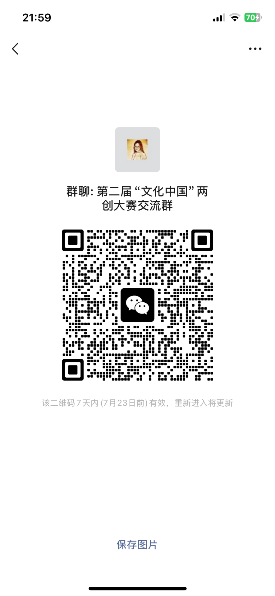 (二)本校参赛服务及交流咨询:请参赛队员扫码,加入微信群,跟进大赛流程、讲座培训以及交流咨询。进群后,请注明“院系➕姓名➕文化中国参赛”。