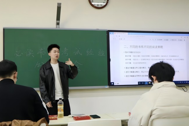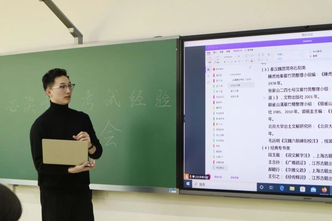 来自汉语言文字学专业的白宇龙同学就如何提高备考效率进行分享,为同学们详细讲解了准备工作的内容、时间安排等方面。对不认识的字形,可以进行重点记忆,每日安排读写认字的时间,注意总结归纳一些不认识的字体。在阅读书籍时,每本书专攻一段时间并整理大纲。白宇龙同学以两本书为例,向同学们讲解具体内容的掌握。一本书是周有光先生的《世界文字发展史》,关键点在与汉字有关的内容;文字的发展阶段、字母文字、三项分类法等内容较为重要。另一本书是《马氏文通》,会考名词解释等,可辅以吕叔湘先生的《马氏文通读本》。可以从暑假开始复习,合理安排复习时间。