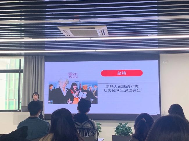 李嘉老师从面试官的角度,分享了在进入职场时应该做什么样的准备。随着问题的提出,现场的同学们以“新手小白”的身份踊跃发言,提出了表达自己对职场上着装上的理解。而李老师则通过现场的图片展示,以选择题的方式来与同学们进行互动,一一讲解,从自己的角度给了自己的经验之谈。面试着装也表现了自己对公司、企业的重视,也要从一些小细节给面试官专业、沉稳的感觉,可以搭配手表,注意发色、鞋子、饰品的搭配与选取。