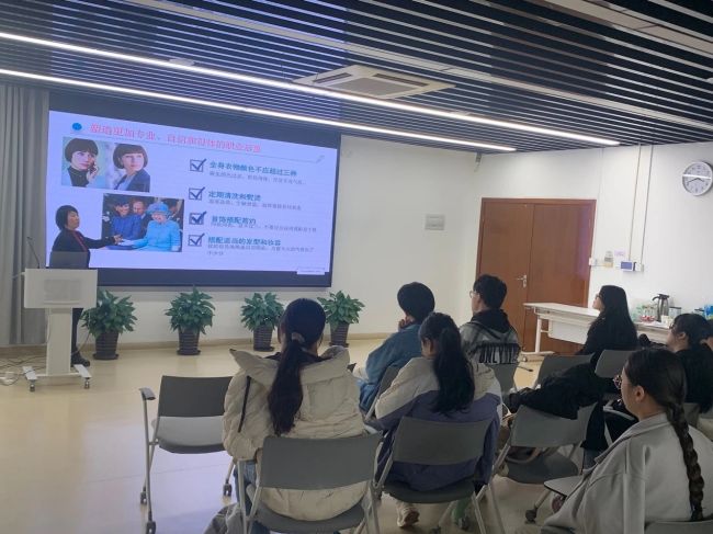 李老师的经验分享也不止是着装方面,她还为同学们总结了面试的时候的八个禁忌,逐一分析做出细致的讲解。除了经验的分享外,现场更有“实战”——嘉宾徐老师耐心细致地为在场的同学们讲解和演示了求职淡妆的技巧。