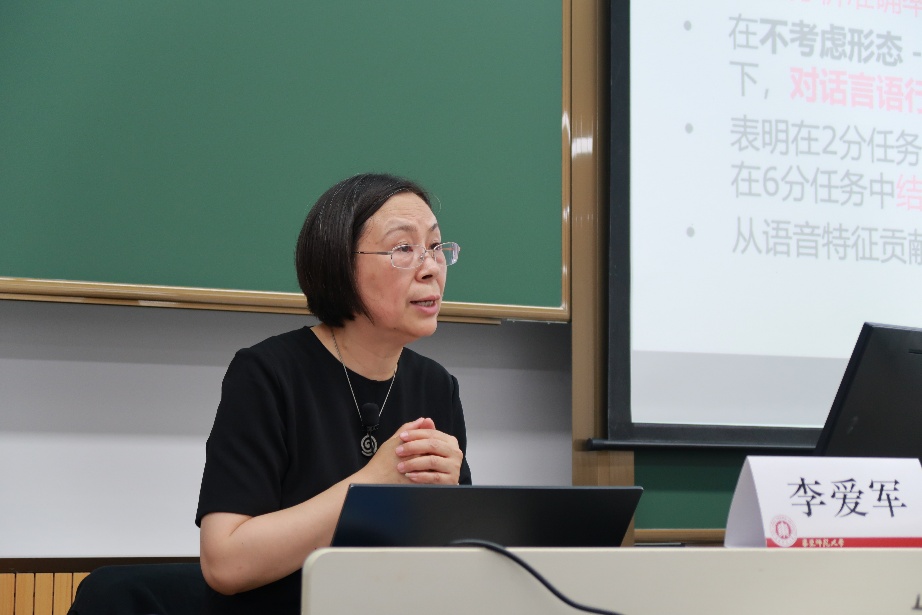 中国社会科学院语言研究所副所长李爱军研究员的讲座“口语意图理解的多维度研究”,基于言语链、韵律、语篇韵律等概念,围绕“语篇韵律与对话言语行为”展开探讨,通过大量实验数据和可视化图表,分析了汉语的回声问、反问句、对话趋同、数据库对情感和意图的识别等重要问题。