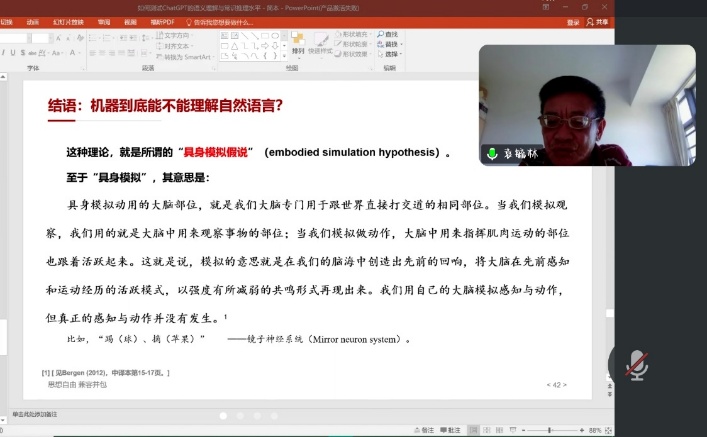 澳门大学袁毓林教授的讲座“如何测试ChatGPT的语义理解与常识推理水平?——兼谈大语言模型时代语言学的挑战与机会”通过线上形式开展,主要解析了ChatGPT在语义理解与常识推理方面现有的成绩,并从工程技术与语言学的角度探究其发展脉络。袁教授指出大语言模型在工程上脱离语言学,是当今语言学亟需面对的困境,但ChatGPT在亲属关系推断上的进步则为此创造了机会。此外,基于对大语言模型的分析和测试可知,让机器具身理解自然语言是不合理的,由此语言学本身的变化和革新势在必行。