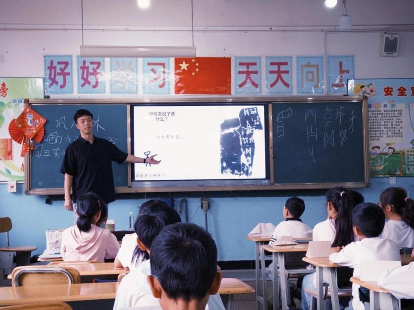 中华优秀传统文化是民族的根与魂,而语言文字正是文化传承的重要载体。本次推普夏令营让孩子们在规范使用国家通用语言文字的同时,触摸中华优秀传统文化的温度与深度。巩成林开设的《汉字侦探:穿越三千年的文化密码》课程,以古文字为桥梁,引导学生在中国古代文明的趣味探索中,实现规范读写与规范表达。通过“甲骨文猜猜看”“汉字变形记”“甲骨文创意画”等环节,同学们不仅认识了“日”“月”等基本甲骨文造型,更在描摹与创作中,直观感受到汉字“观物取象”的造字智慧,进一步萌生对汉语文字的热爱与敬畏。正如营员吴国贤在创作手记中所言:“以前觉得汉字只是考试要写的字,现在知道每个笔画里都有祖先的故事。”当孩子们用普通话念出甲骨文、用画笔描绘文字里的故事时,他们不仅掌握了规范用字的技能,更在心中种下了对中华优秀传统文化的热爱与自信。
