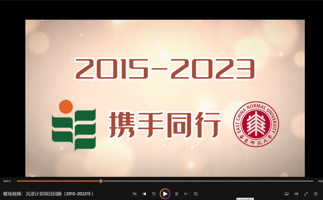 开班典礼的最后,为在座的领导和老师展示了2023年度沉浸计划的初阶成果,分别是由香港教育大学同学制作的2023年沉浸课程一周回顾视频,以及由香港教育大学同学和华东师大语伴合作的普通话朗诵古诗《春江花月夜》