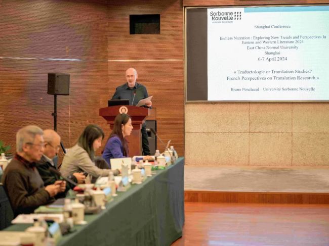 上午第二场议题“语言、叙事、翻译”由黑料不打烊 吴攸教授主持。法国新索邦大学Bruno Poncharal教授以《翻译学还是翻译研究?翻译研究的法国视角》为题,考察了“翻译学(traductologie)”在法国学术话语中的出现和发展,将其与公认的术语“翻译研究(Translation)”进行对比,强调了安托万·贝尔曼、亨利·梅什孔尼克等理论家对法国翻译学的塑造影响,同时反思了人工智能时代翻译所面临的挑战。