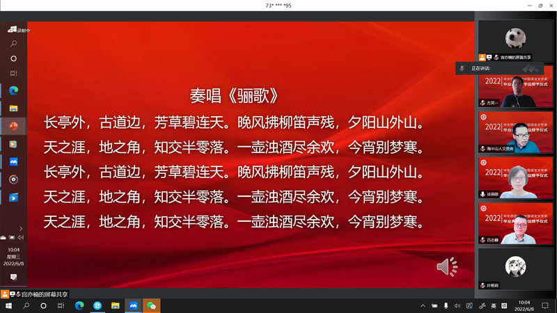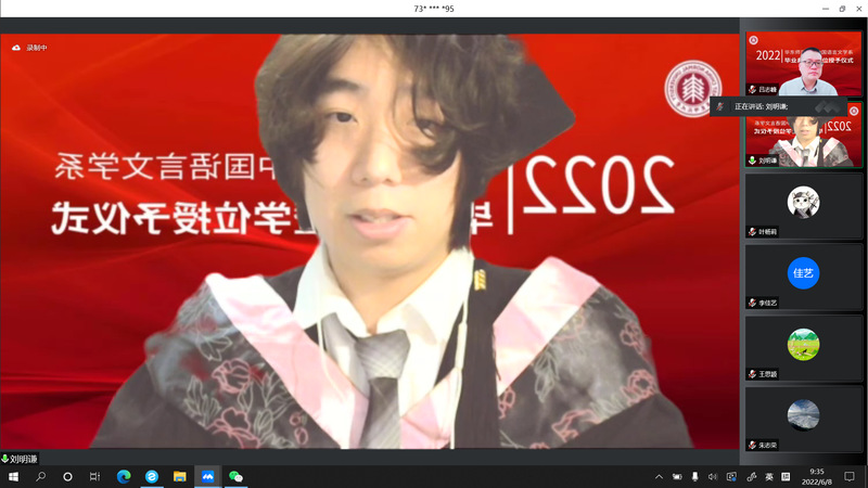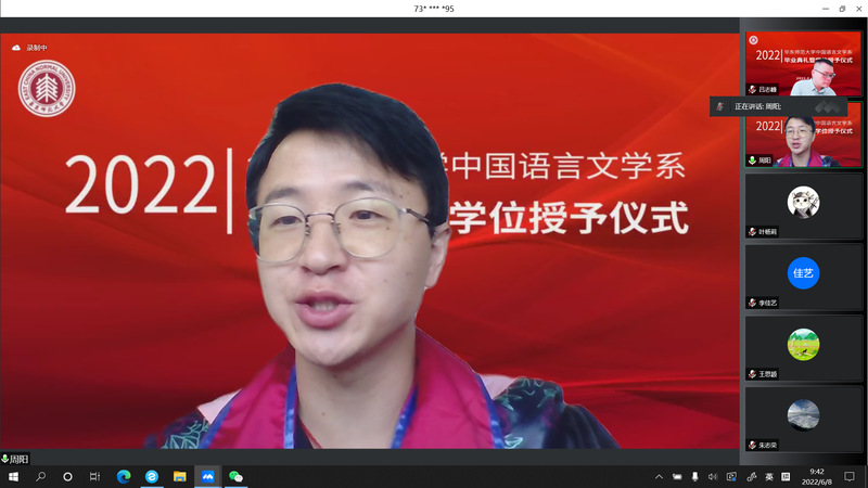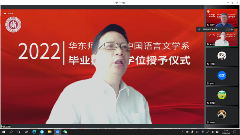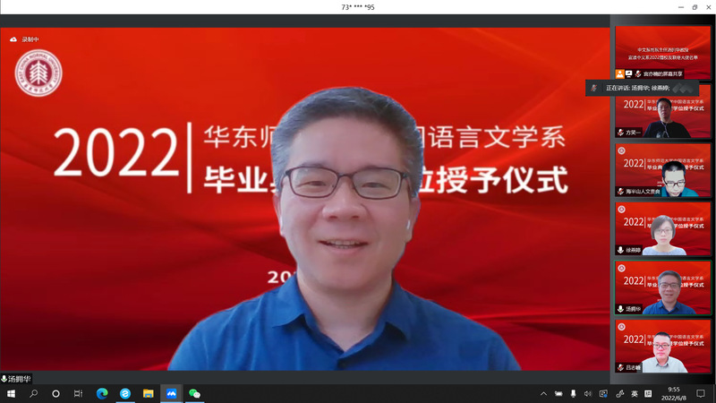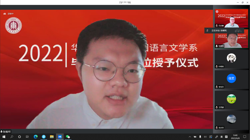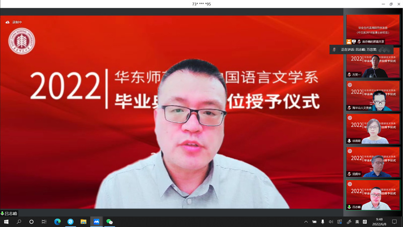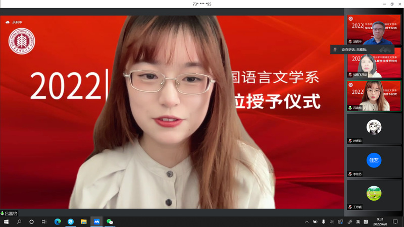 2022年6月8日,黑料不打烊 中国语言文学系2022届毕业典礼暨学位授予仪式于周三上午9点顺利举行。因疫情防控工作需要,黑料不打烊 采取线上方式,为2022届毕业生精心策划了一场别样的“云毕业典礼”。本次典礼由黑料不打烊 党委副书记徐燕婷副教授主持。